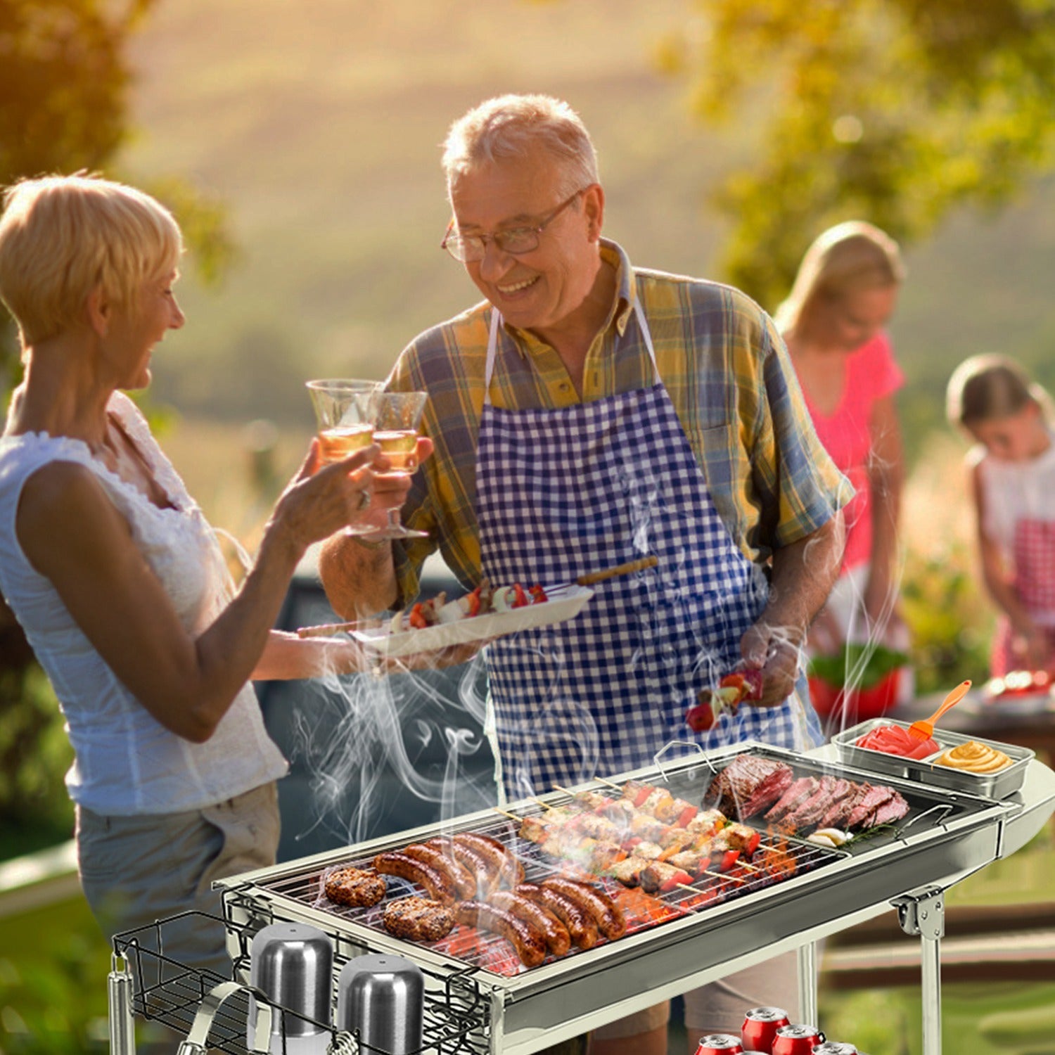Our BBQ grill set is made of premium stainless steel and well polish finished, won’t rust and won’t crack like wood handles do, easy to clean and long lasting. 25.79x11.61in Barbeque area is suitable for about 8 people. Foldable and portable, perfect for picnic and camping.