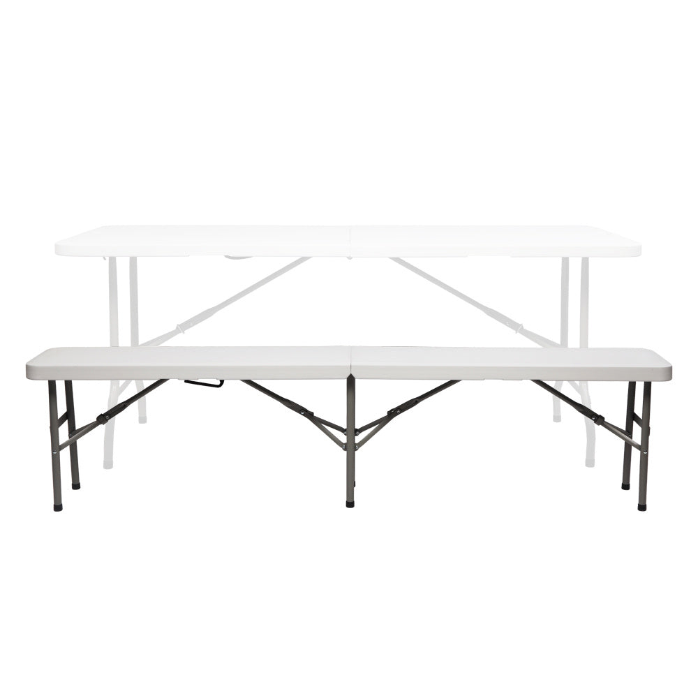 The 6FT Outdoor Courtyard Foldable Bench is perfect for outdoor party, picnic, camping, wedding and more. It is constructed with a polyethylene top and a sturdy tubular steel frame and legs to offer high strength, water resistance, fire retardance and durability. It can be folded and extended easily provide enough space to your guests and save room for storing it under a bed or in a closet. Rubbers on the legs prevent your floor from scratches or any damage. Don't hesitate to order now!