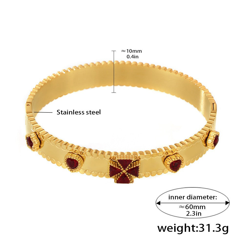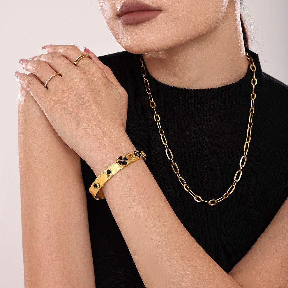 This bracelet cleverly combines lucky meanings with romantic elements to create an exquisite and loving fashion accessory. The four-leaf flower pattern in the center symbolizes luck and hope, and the heart-shaped gemstones next to it are inlaid and embellished, making the whole bracelet more flexible and elegant. It is an ideal choice for expressing blessings and self-style.