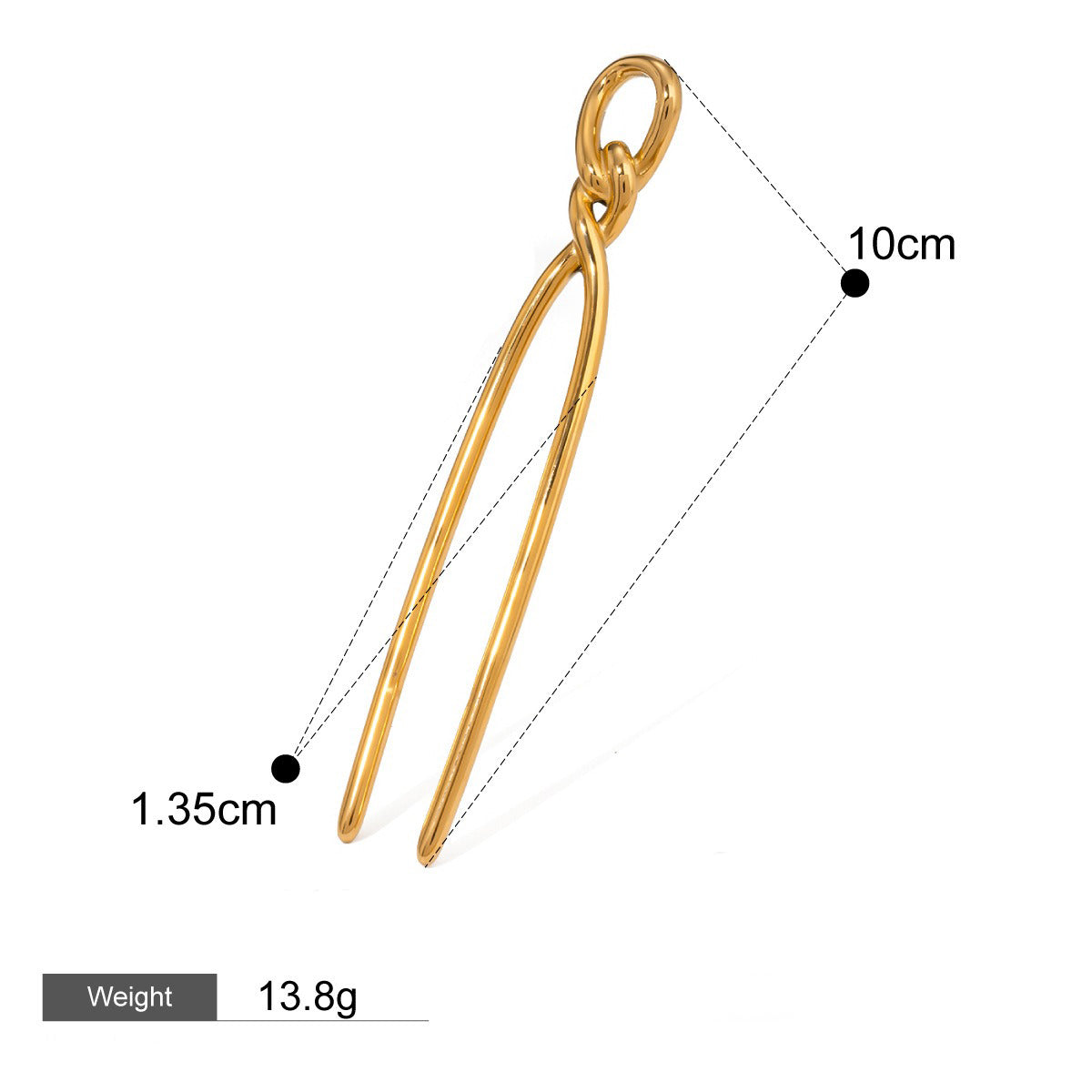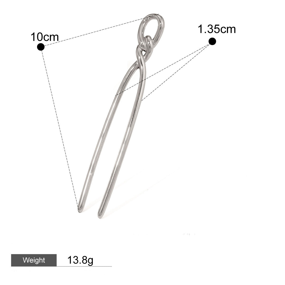 This hair accessory is inspired by a unique geometric shape, perfectly showing the combination of simplicity and modernity. Its design innovatively combines U-shaped and oval elements. The top is a hollow oval, and the bottom crosses to form an exquisite knot design, and two cross branches extend downward, forming a unique and artistic hairpin. This hair accessory has both the avant-garde sense of modern geometric style and retains simple and elegant lines. It is suitable for women who pursue personality and taste.