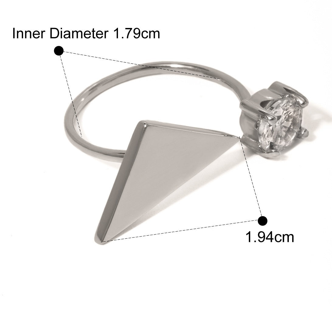 The ring design is simple and atmospheric, using geometric triangle elements and inlaid with a round gemstone. The sharp lines of the triangle contrast with the soft curves of the round gemstone, showing a unique design aesthetic.