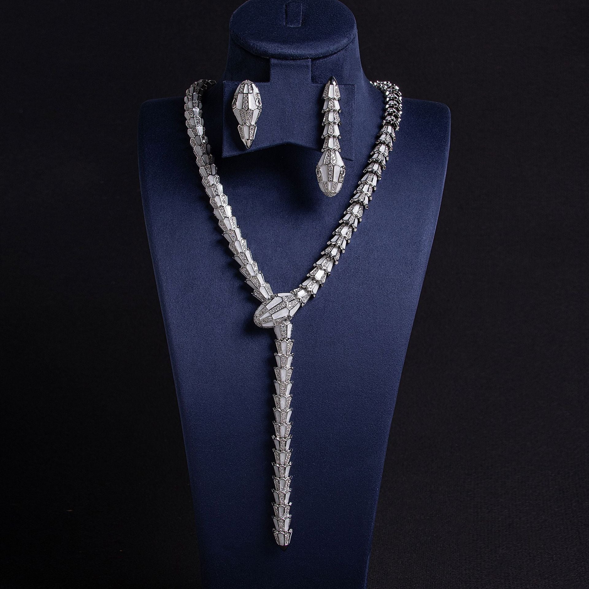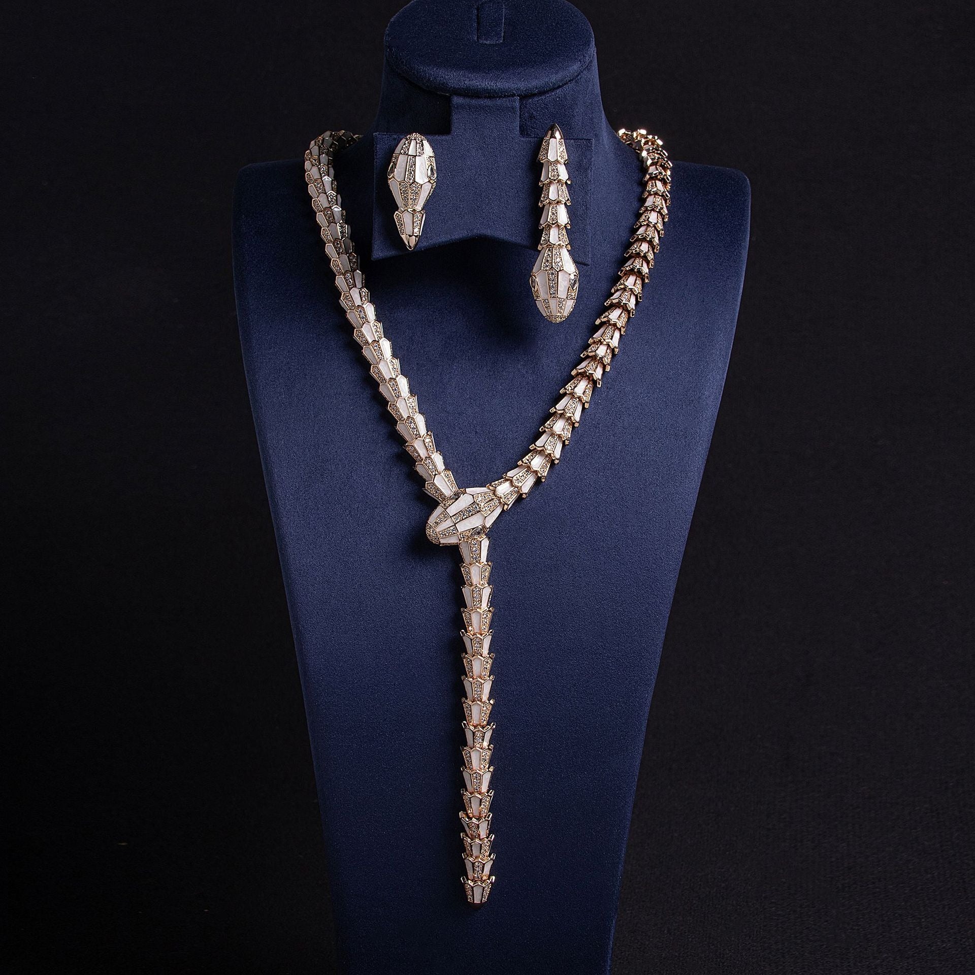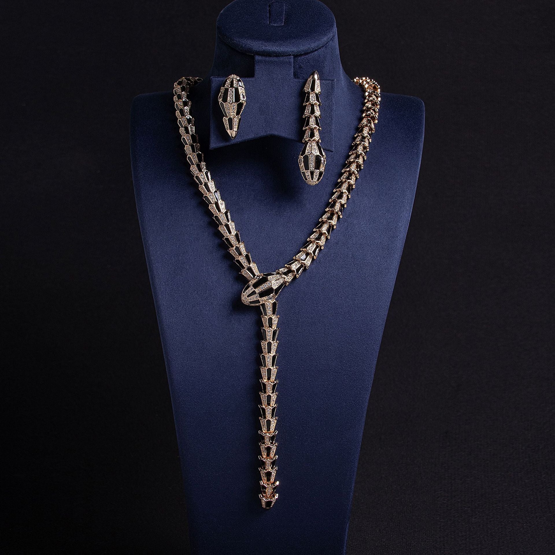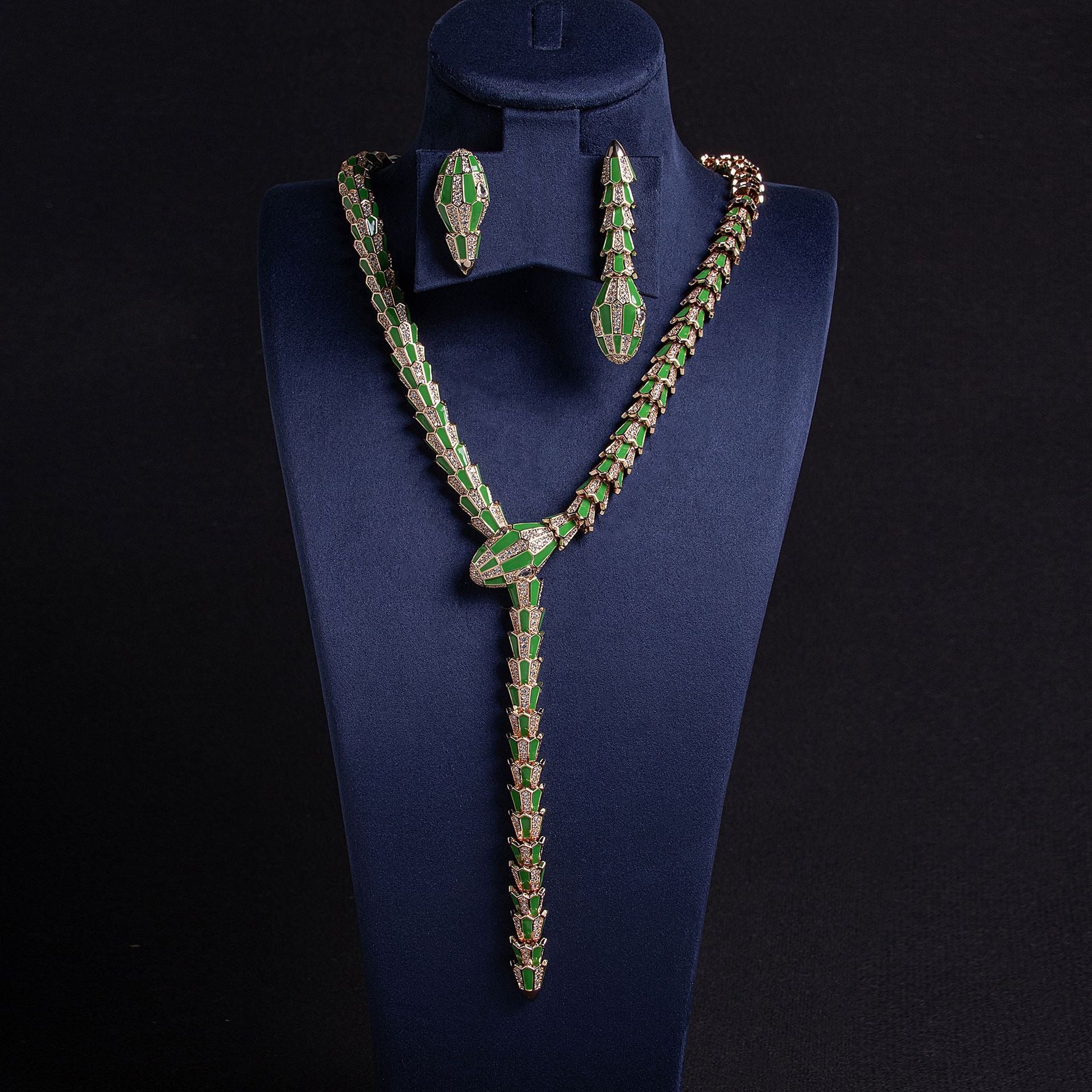 The necklace and earrings are both designed in snake shape, with smooth and winding lines, full of tension and shape. The snake body is cleverly inlaid with exquisite gems, with a strong sense of layering, dazzling, and presenting a fashionable effect with great visual impact.