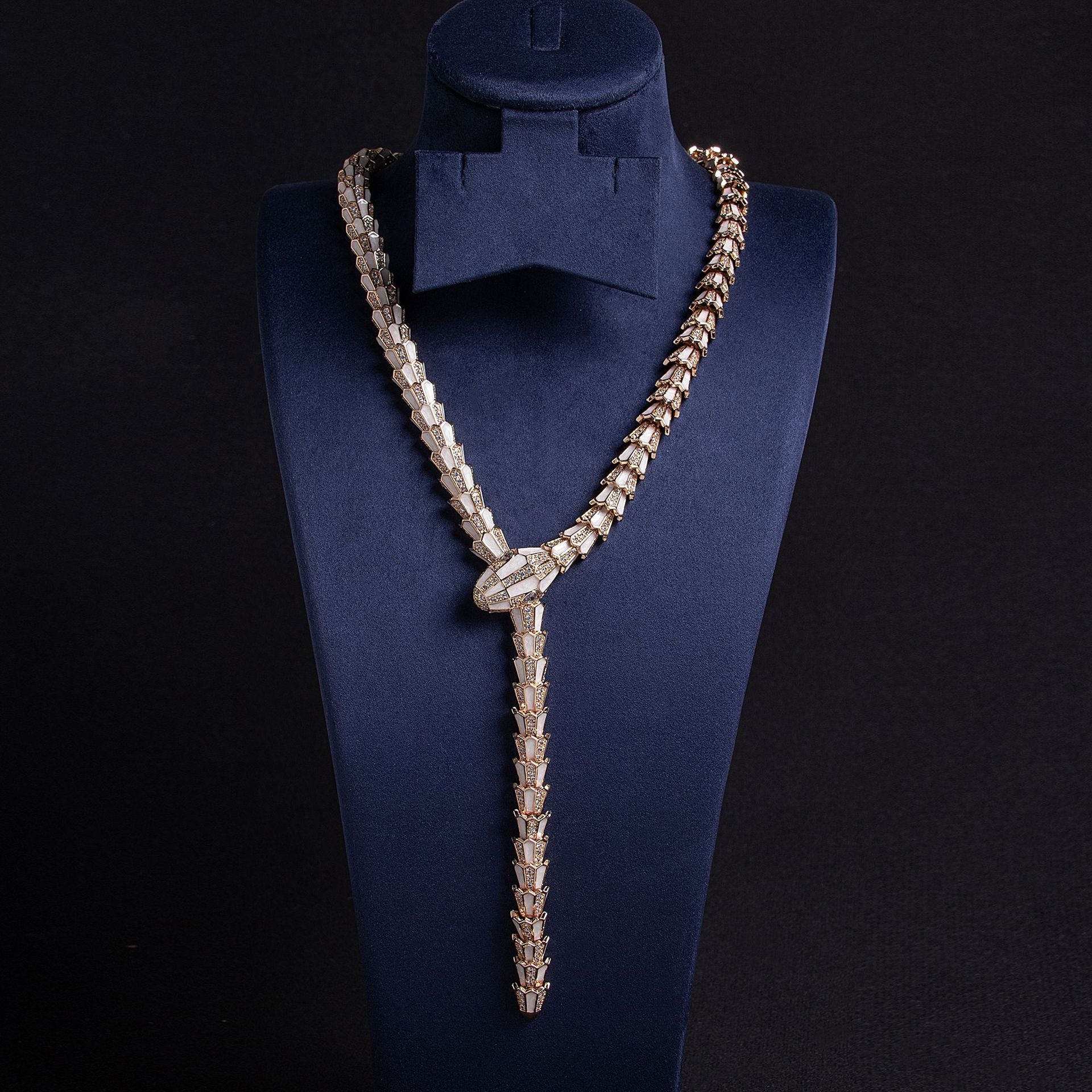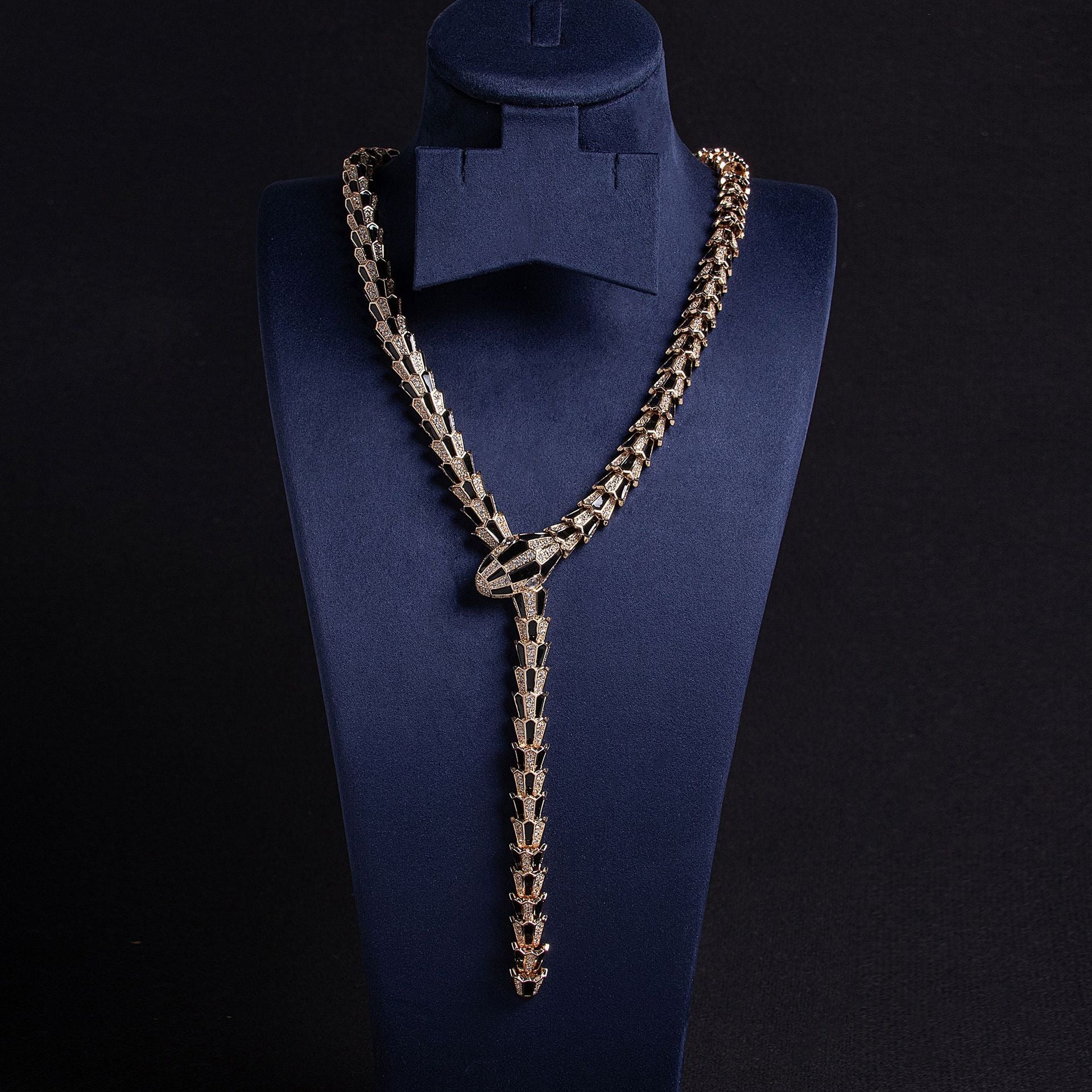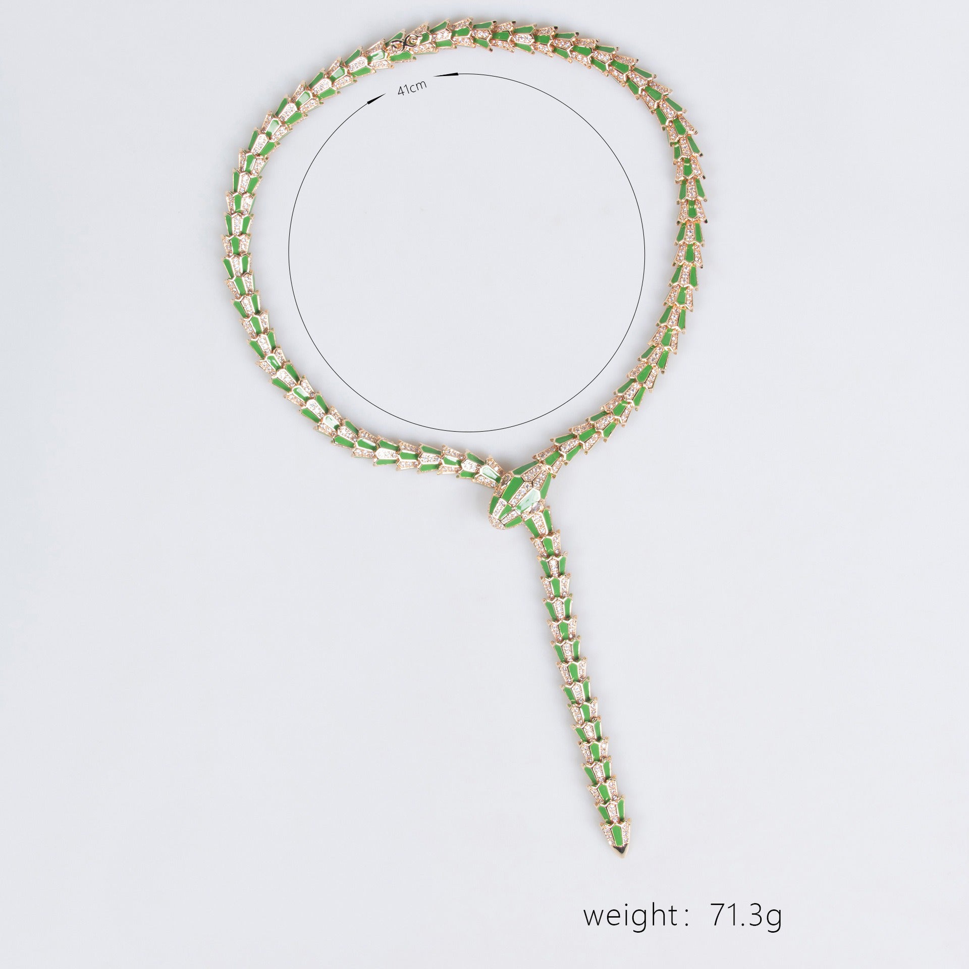The necklace and earrings are both designed in snake shape, with smooth and winding lines, full of tension and shape. The snake body is cleverly inlaid with exquisite gems, with a strong sense of layering, dazzling, and presenting a fashionable effect with great visual impact.