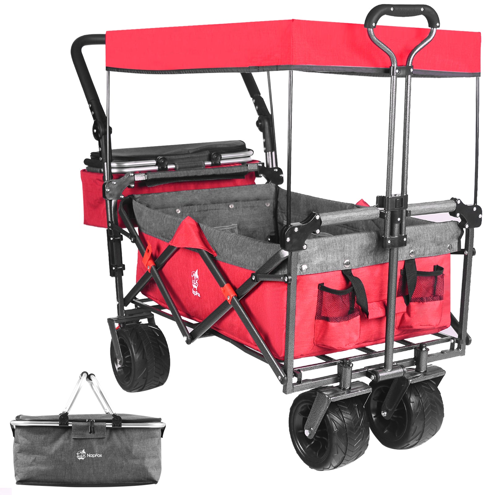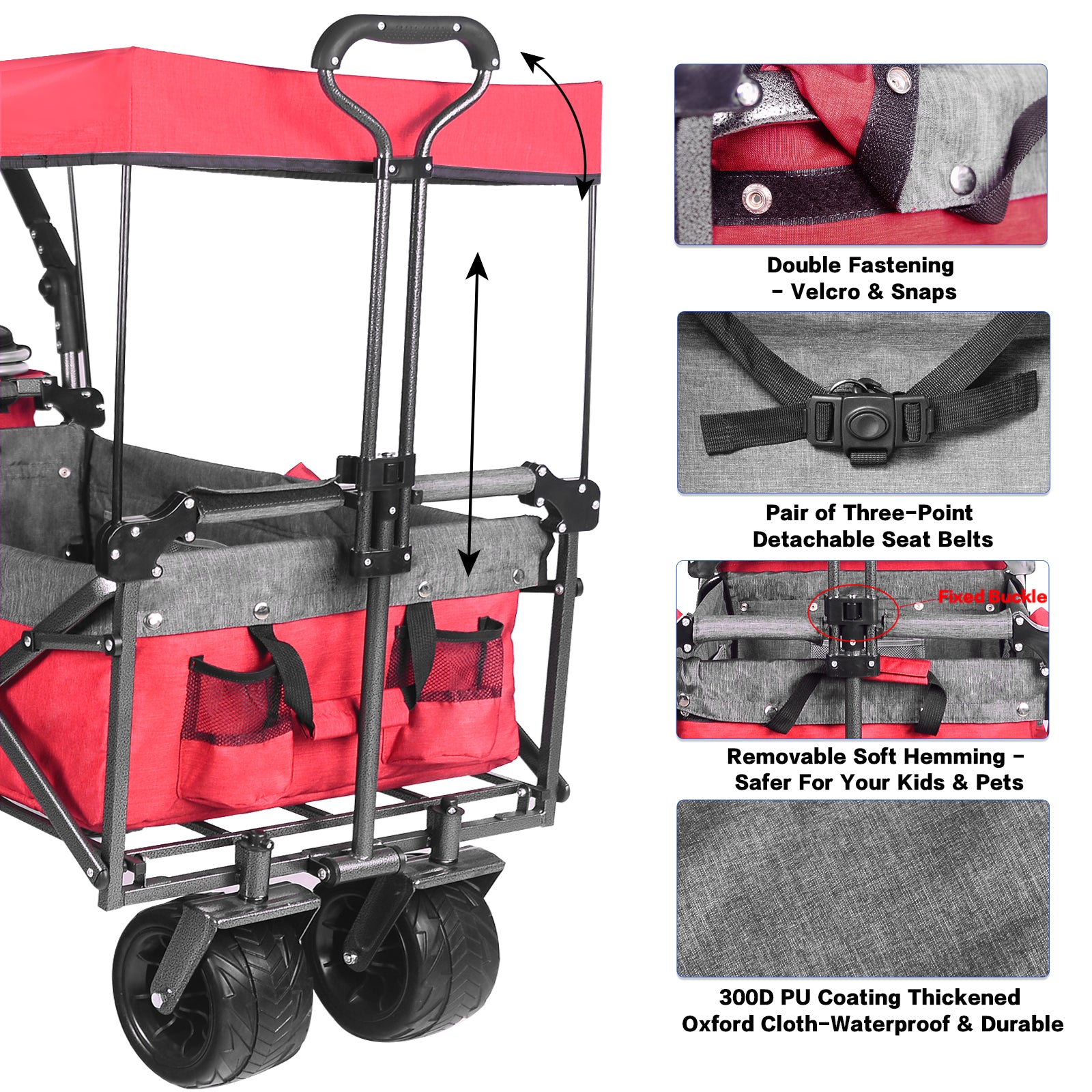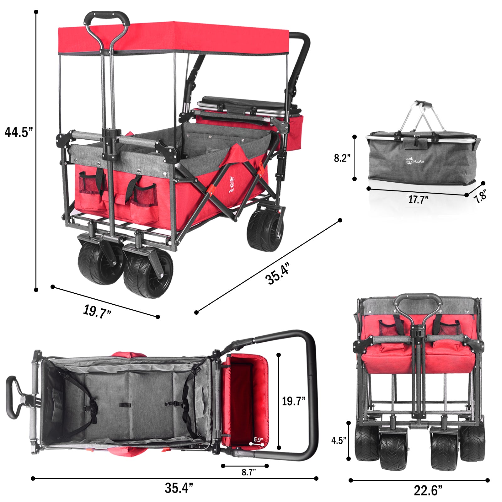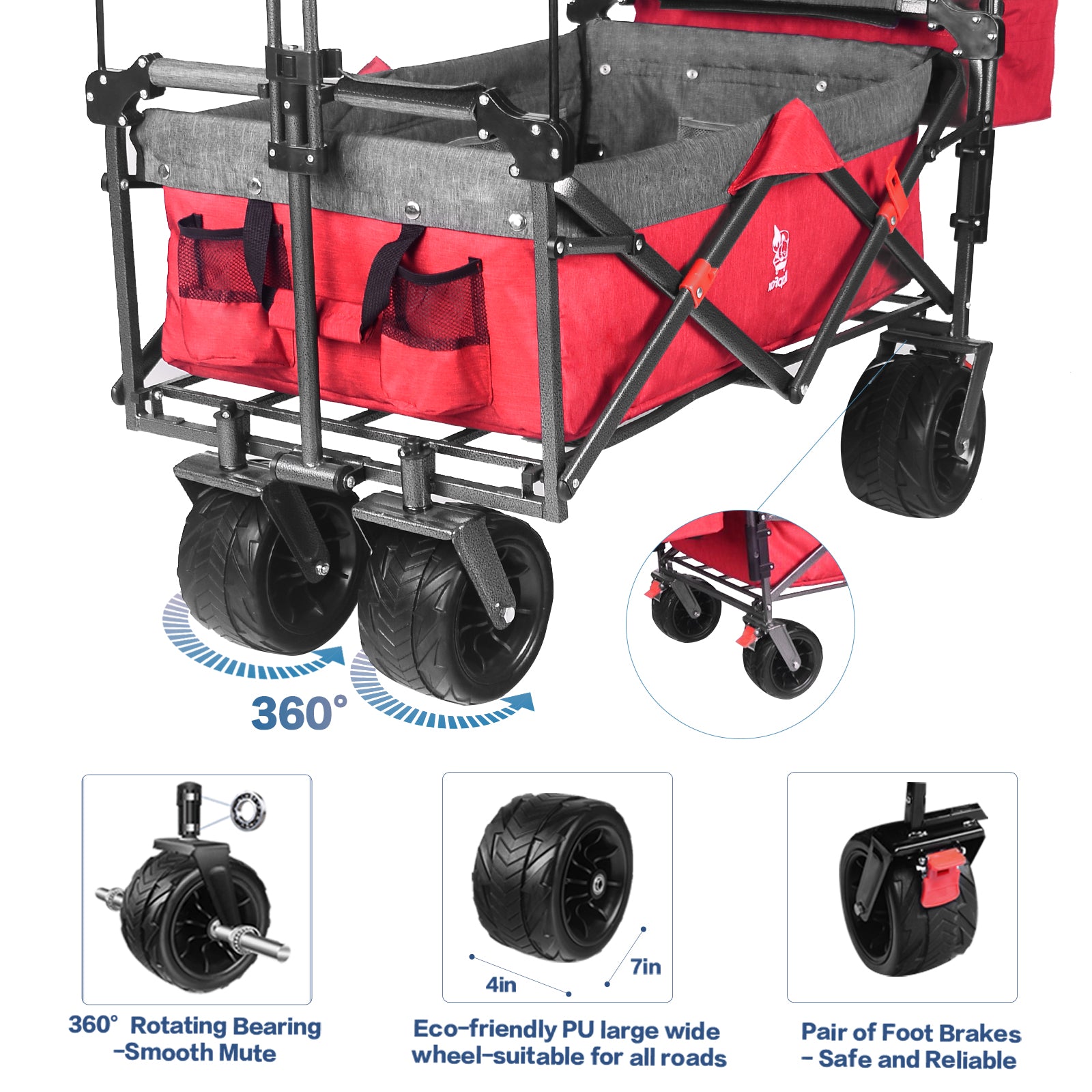• All-Terrain Wheels: Equipped with 360° rotating large wheels (7” diameter x 4” wide), this wagon glides effortlessly over beach sand, ramps, stones, and lawns. Plus, the rear foot brakes ensure safety when parked.
