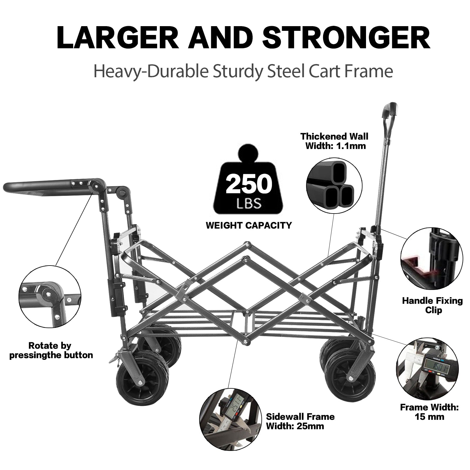 • High-Quality Material: Crafted with a robust 1.1 mm thick iron frame and 600D oxford fabric, this wagon is built to last. Waterproof and easy to clean, it can handle a maximum dynamic load of 220lb-250lb.