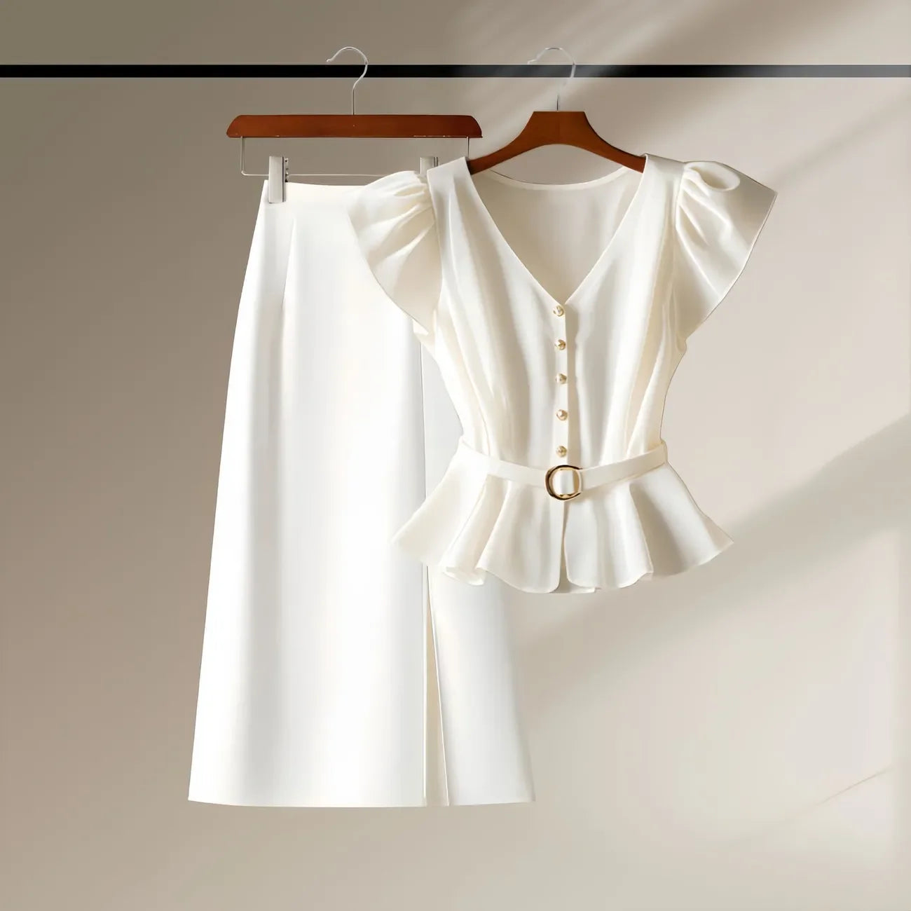 Summer New High-end Chiffon Shirt V-neck Slimming Blouses Pleated Skirts A-line Midi Skirt Set White Two Piece Set Women Outfits