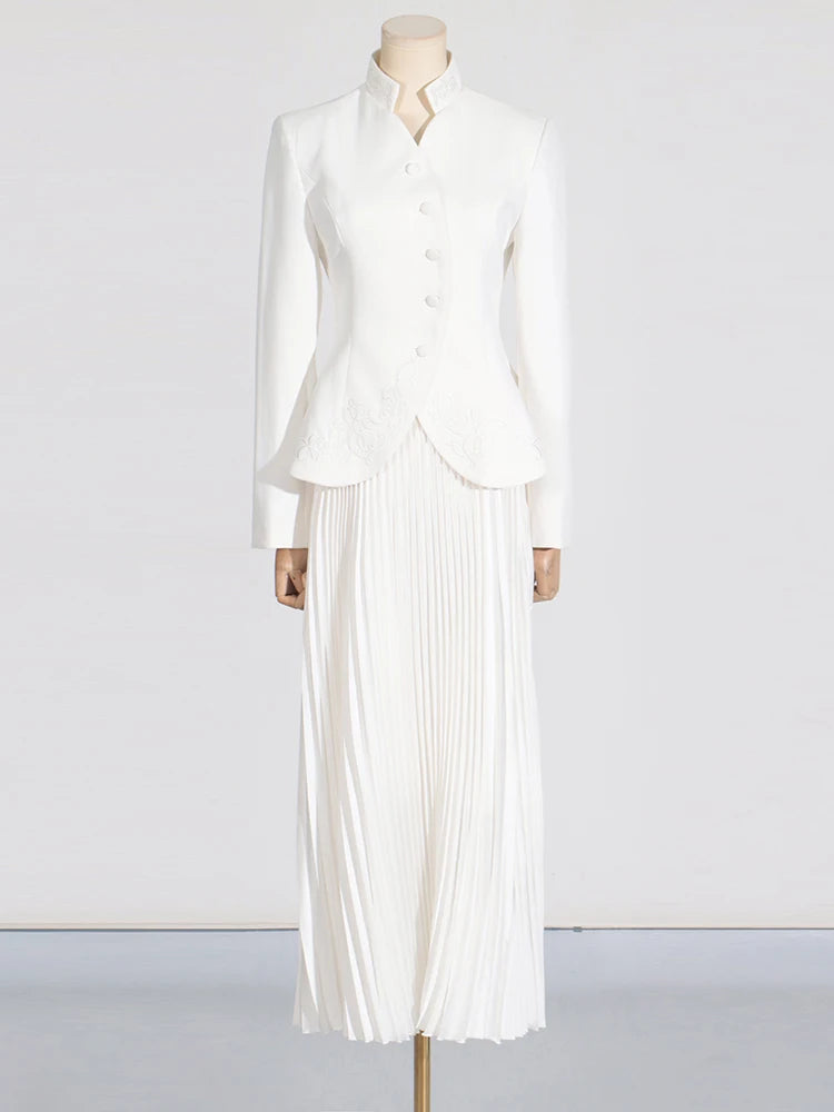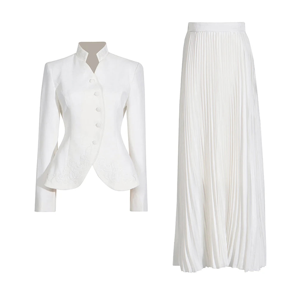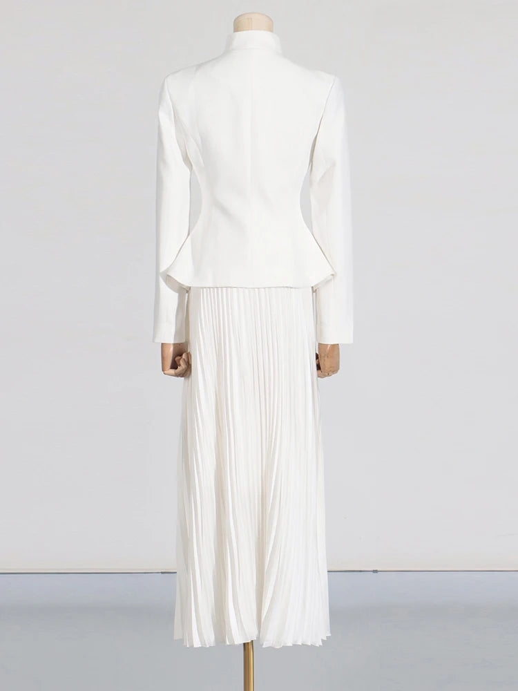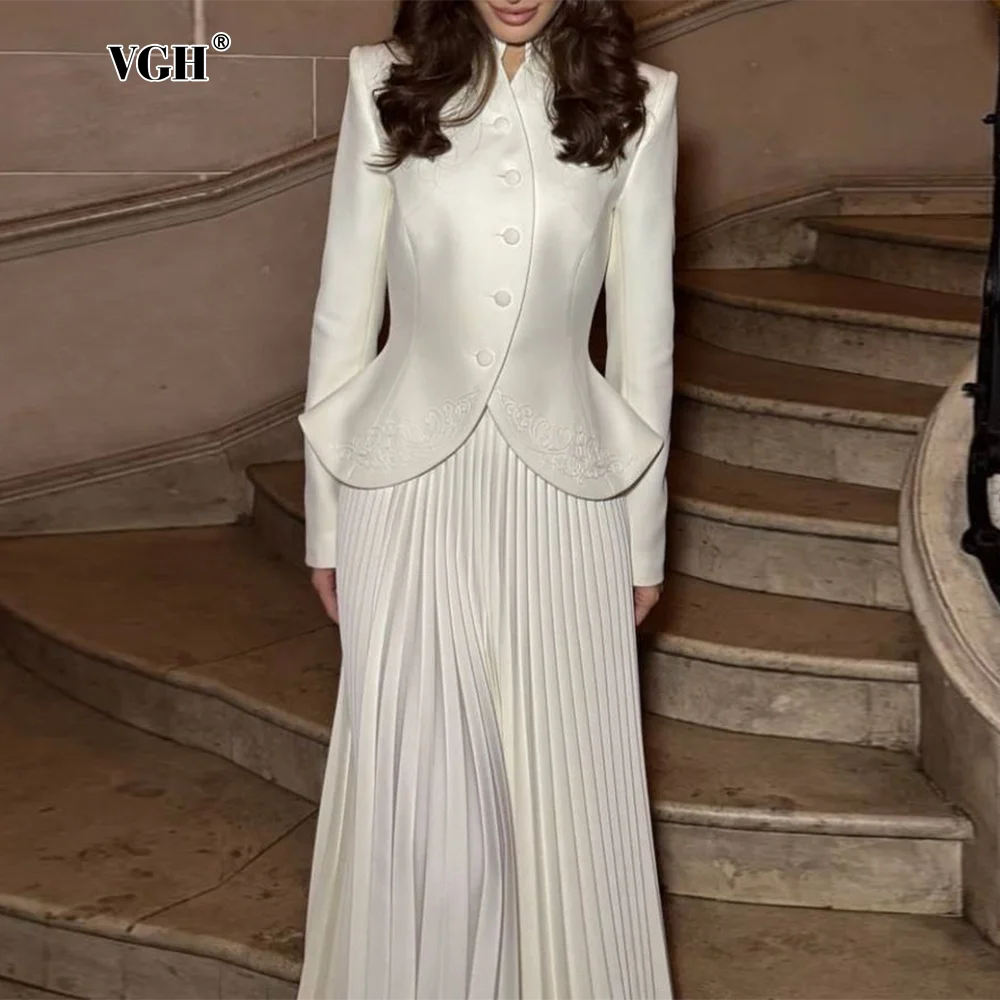 VGH Solid Minimalist Two Piece Set For Women Stand Collar Long Sleeve Spliced Button Tops High Waist Skirt Chic Set Female New